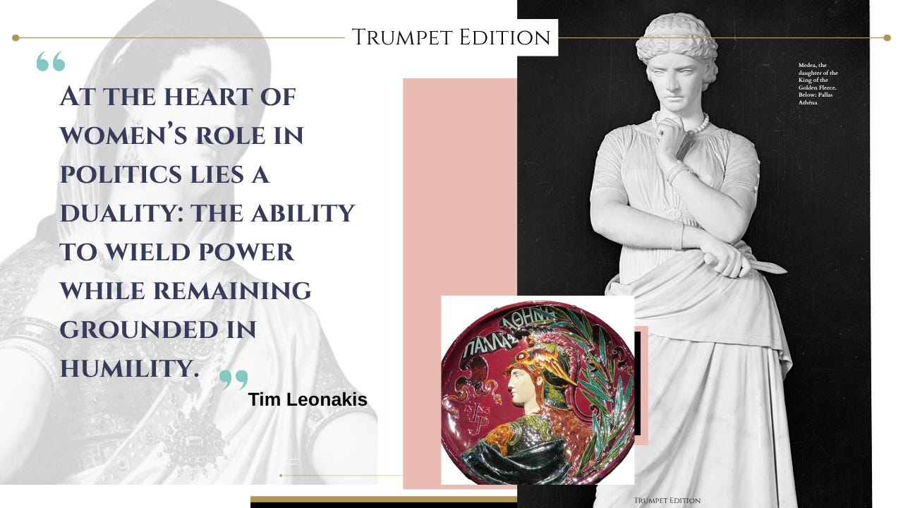 ‘Trumpet Edition’ contributor, Tim Leonakis, writes a thought-piece on the duality of women’s roles in politics through the lens of Western mythology—both as powerful leaders and humble protectors—and their essential contribution to the pursuit of happiness and peace.